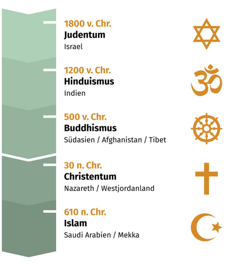 Auf den Unterseiten stellen wir auszugsweise die fünf Weltreligionen, Judentum, Hinduismus, Buddhismus, Christentum und Islam vor. So erhalten Sie in jede der Religionen einen kurzen Einblick für ein besseres Verständnis und vielleicht sogar Anregungen.